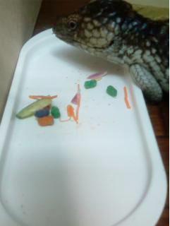 さて今日は食事の日。 メニューは・・・トマトスライス、キュウリスライス、かぼちゃスライス、そら豆、ニンジン、オグラ、イグアナフード10粒、コオロギ5匹、それにカルシウムを添加しました。